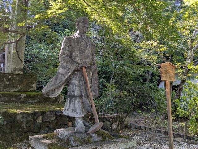 近くには角倉了以の像も。徳川家康の政策のもと、朱印船貿易を行い、「水運の父」とも称される人物。この二尊院は、そんな角倉一族の菩提寺でもあるそう。