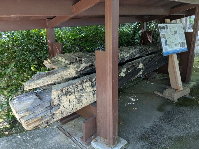 横たわる木材は木樋・泥樋管。江戸時代中期頃、水不足に悩む嵯峨野の民のために、角倉了以や吉田光長・光由兄弟によって築造された菖蒲谷隧道から出土したものであるそう。