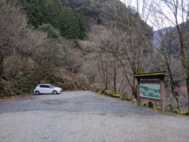 宝来荘の近くに駐車場がありますが、ここでは駐車せずにもう少し奥へ車で進みます。すぐに第3駐車場(水晶淵)と書かれた駐車場があるので、こちらに停めるのがおすすめ。ここから水晶淵までは徒歩200mほどです。
