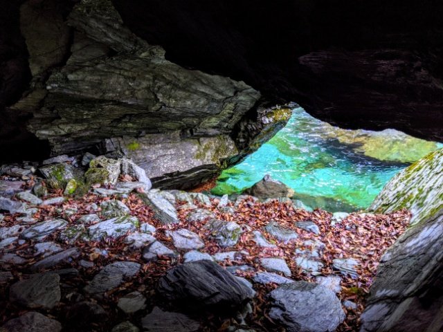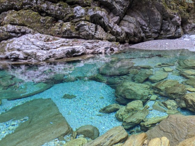 その先には名前もない淵。こちらも洞穴では無さそうですが、薄めで繊細なブルーに輝きます。