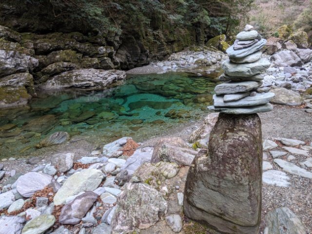 なお、水晶淵からここまで来るには岩場を歩くことになるので、動きやすい服装と滑りにくい靴推奨です。