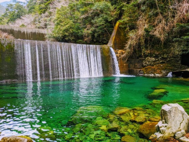 水晶淵からさらに奥へと進むと、コンクリート製の砂防ダムが見えてきます。砂防ダムから流れ落ちる水が滝のようで、その滝つぼがエメラルドグリーンに輝く。水晶淵に勝るとも劣らない美しさ。