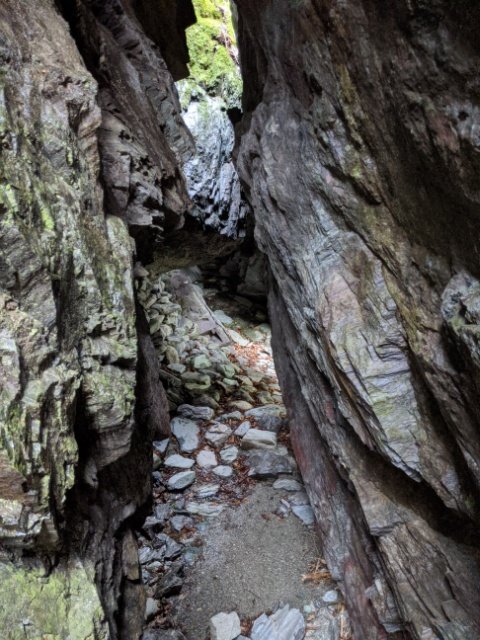 さらに進むと、遊歩道は岩の切れ目の中に入っていきます。どうやら、こちらがせり割洞穴。岩と岩の隙間が、まるで洞穴のようになっています。
