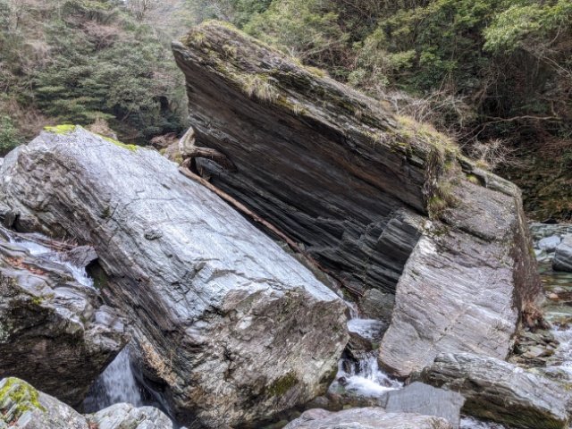横たわる巨大な岩。これがせり割洞穴かと思いきや、こちらは大岩淵。長さ6m、周囲15mはありそうな巨岩は動きが無くとも迫力あります。