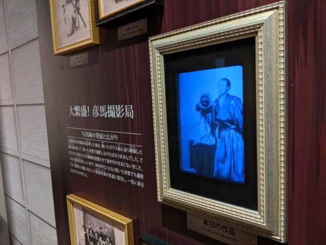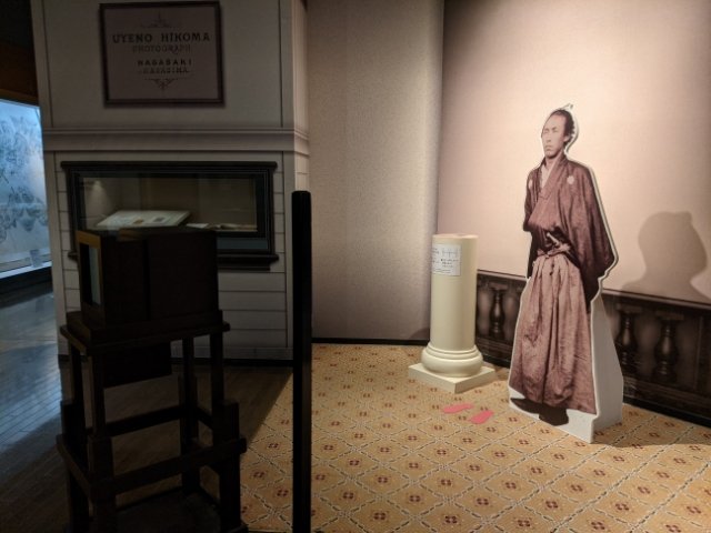 坂本龍馬が立っているこちらは写真家・上野彦馬によって開かれた上野撮影局。幕末に活躍した日本の写真家で、教科書でも見かける坂本龍馬や高杉晋作らの肖像写真を撮影した人物です。