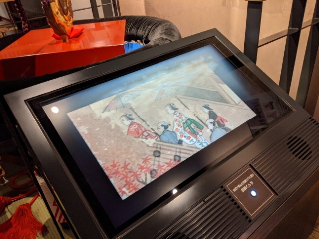 ボタン式のモニターが設置されており、練習風景や本番を映した実写映像で、その歴史や特徴を解説。現在は10/7〜9の3日間に行われておりますが、稽古始めとされている6/1の小屋入りの様子から見ることができます。