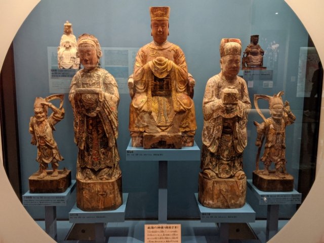 ずらりと並んだ木像。このうち中央に鎮座するのが、媽祖(まそ)という神様。航海の神様といわれており、長崎に来る中国船は必ず祀っていたそうです。長崎港に入った唐の貿易船の媽祖像は、入港とともに船から降ろされます。滞在中は唐寺にて安置、また出航の際は船に乗せていたとのこと。