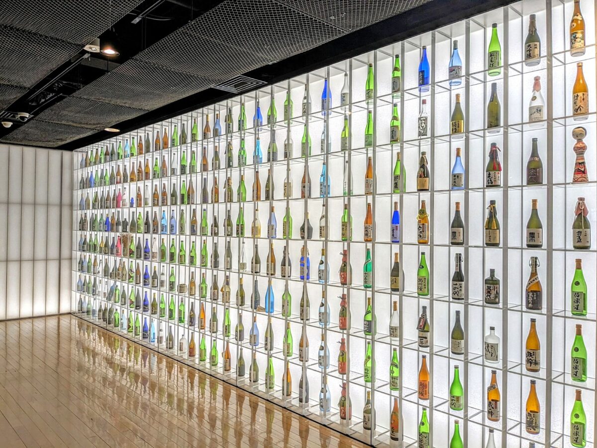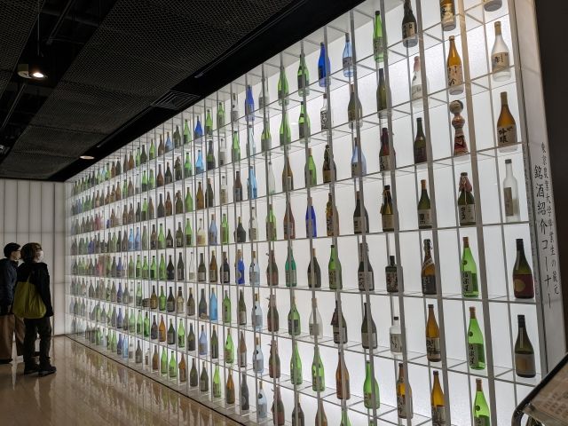 ショーケースにずらりと並ぶのはお酒の瓶。「越乃寒梅」「久保田」「八海山」など、非常に有名なお酒も並んでいます。実はこちら、東京農業大学卒業生の蔵元の銘酒紹介コーナー。あの有名なお酒も、東京農大出身者が手掛けているのですね。