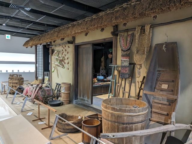 再現された民家とともに農機具が展示されています。馬に曳かせて畑を耕す「馬鍬(まぐわ)」、「足踏み脱穀機」など、モータリーゼーションがはじまる以前の古農具がずらり。展示は一部であり、実際のところ約3,600点もの子農具を収蔵しているそうです。