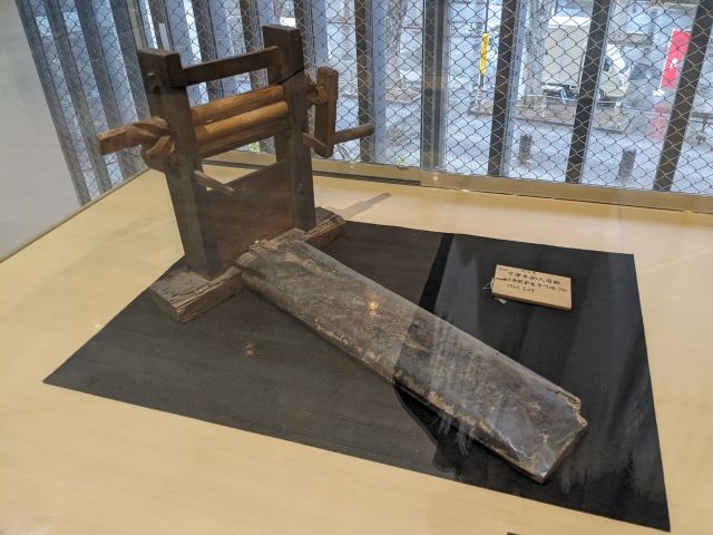 1点だけショーケースで特別扱いな「のくろ」。収穫した綿花から種を取り除くための道具です。NHK大河ドラマ「おんな城主 直虎」にも登場、劇中では綿の栽培で領地の財政を立て直しを図るというシーンで出演したそうです。みなさん、見覚えありますか・・・?