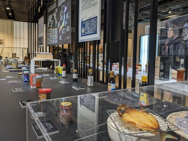 今回訪問した2023年10月12日(木)~4月6日(土)は、企画展示である醸造科学科展「JOZOO -醸造と発酵のせかい-」を開催中。「くさや」「スクガラス」などインパクトあるものから、「タバスコ」「メンマ」「かつお節」など日常的なものまで、様々な発酵食品がずらりと並んでいました。