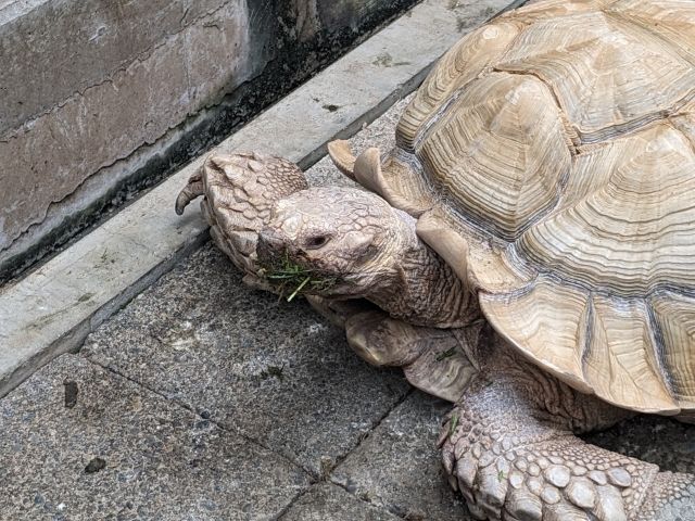 温室内には大きなケヅメリクガメも。餌をはむはむしながらのっそりと歩く姿がたまりません。