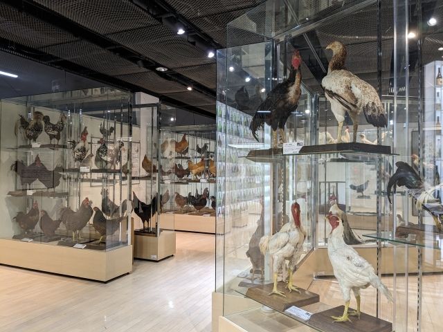 2階の展示室に広がるのはニワトリの剥製標本コレクション。「烏骨鶏(ウコッケイ)」「矮鶏(チャボ)」「軍鶏(シャモ)」といった有名な種類から、「薩摩鶏」「比内鶏」などの地鶏、「東天紅」「唐丸」などの長鳴鶏など、様々な種類を見ることができます。
