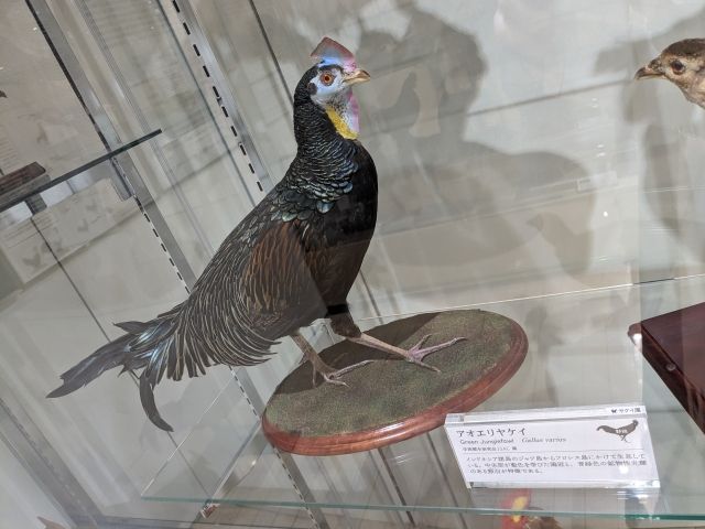 日本だけでなく世界のニワトリも。こちらのアオエリヤケイは、インドネシアのジャワ島からフロレス島にかけて生息している種類。パステルカラーのトサカが華やかです。