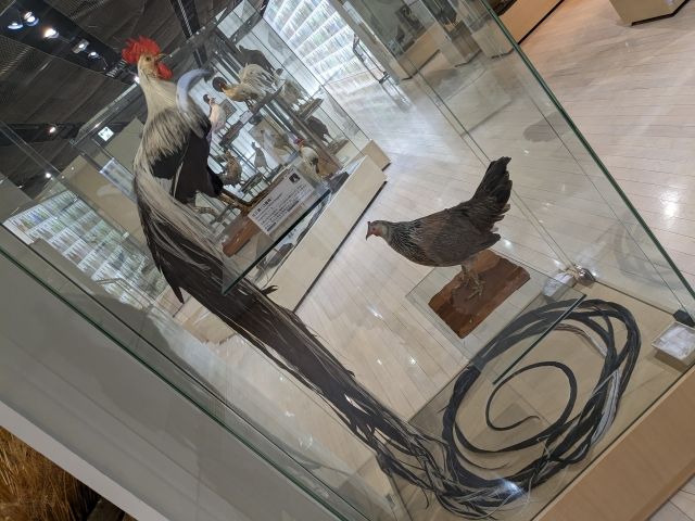 尾羽が伸び続け、長い尾を持つ「尾長鶏」。この剥製は6mもあり、さらに長いものは13mを越えることもあるそう。「土佐のオナガドリ」として天然記念物にも指定されています。(尾長ニワトリについてはコチラの記事もあります!)