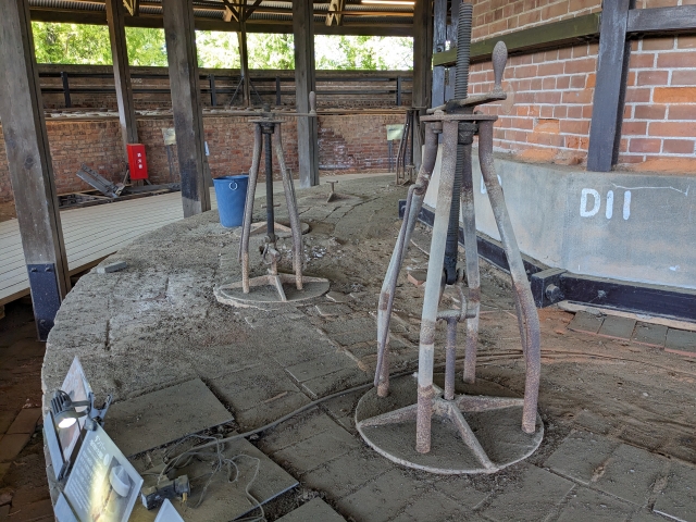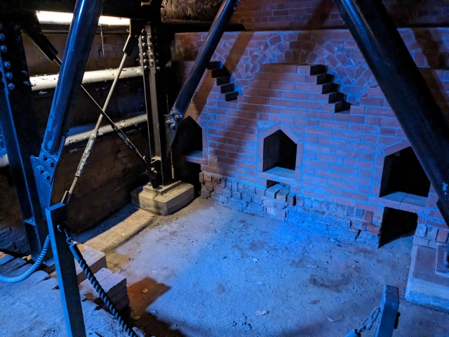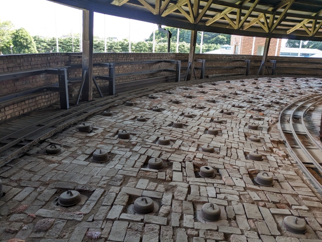 外周部分にずらりと並んでいるのは鉄の蓋。それぞれが燃料となる粉炭を追加するための投炭孔(とうたんこう)となっています。その数は全部で400箇所。周囲には粉炭を運ぶための炭車とレールも備えていたそうです。