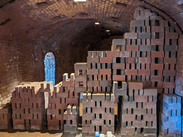 しかし、この輪窯はそんなレンガ焼成に革命的な効率アップをもたらします。内部が16個の窯に分かれており、1つ目の窯で点火して焼いている間に、2つ目の窯ではあらかじめ並べていたレンガを余熱で乾燥。その間にさらに3つ目以降の窯にレンガを並べてスタンバイ。