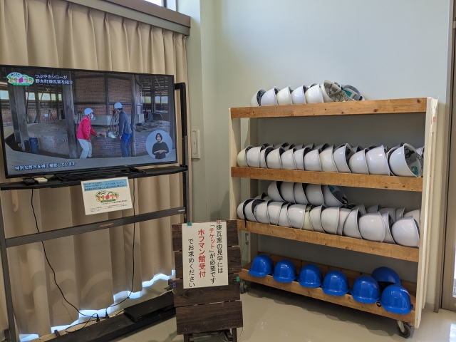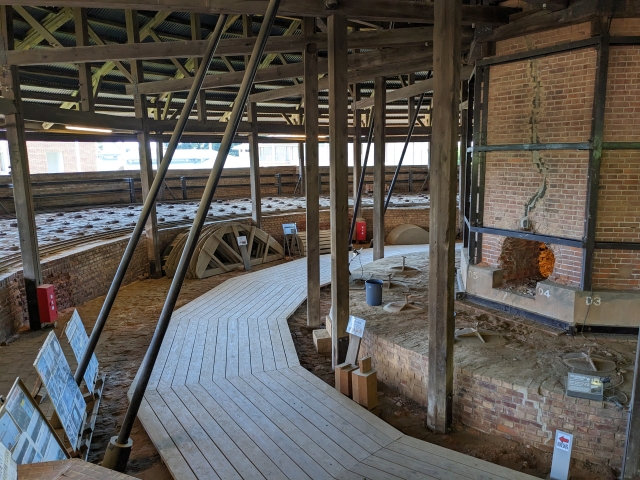 そんな貴重な輪窯ですが、ここではなんと内部見学が可能。しかも予約などは特に不要なのです。受付は、輪窯のそばに建つ野木ホフマン館。カフェや休憩スペース、ちょっとした展示のある施設です。