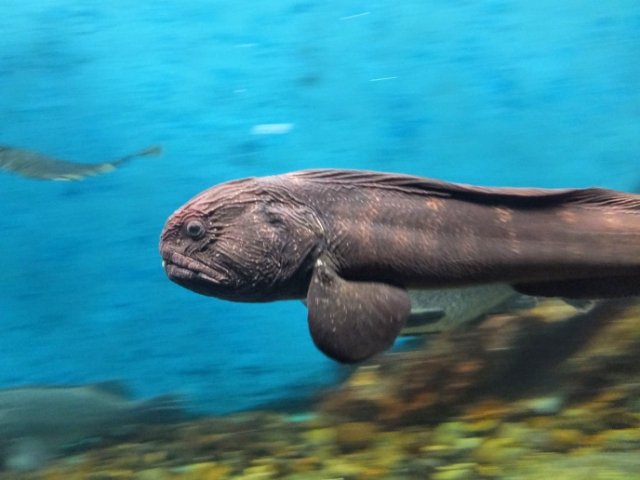 オオカミウオもぐるぐるしてる!鋭い歯を持ち怖い顔をしてますが、性格は大人しいそう。