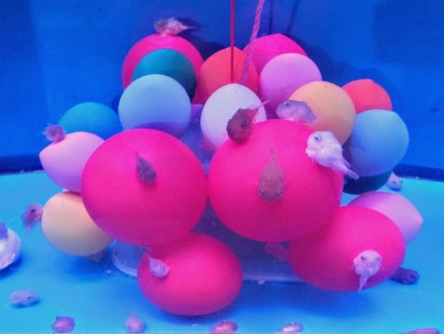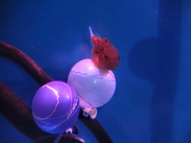 アザラシと並ぶもう一種の主役はフウセンウオ。名前の通り丸っこいカタチをしたサカナなのですが、腹ビレが吸盤のように進化しておりあちこちにくっついています。