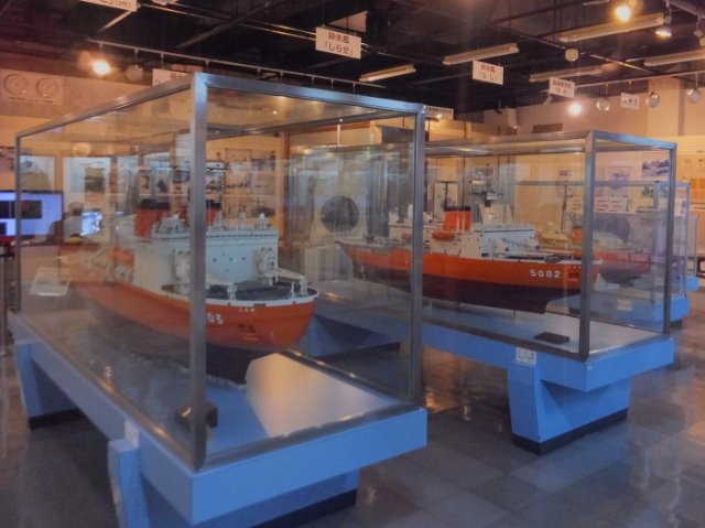 館内の一画にある南極展示コーナーは、大人でも楽しめる内容。南極観測船である、『宗谷』『ふじ』『しらせ』の模型を発見しました。