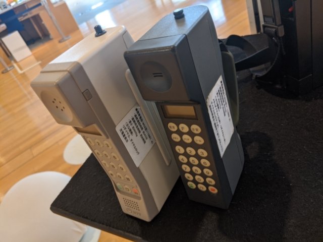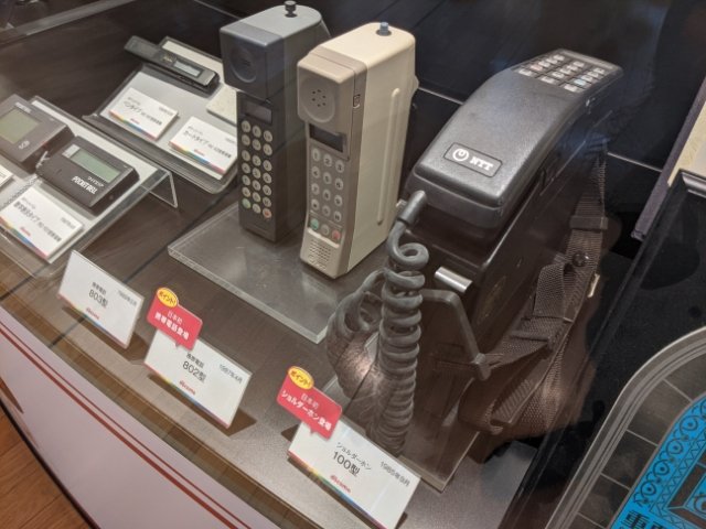 ショルダーホンの左に並んでいるのが、日本初の携帯電話802型(1987年4月)と803型(1989年2月)。ショルダーホンに比べると半分くらいの大きさですが、まだまだ大きさと厚みがあります。