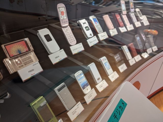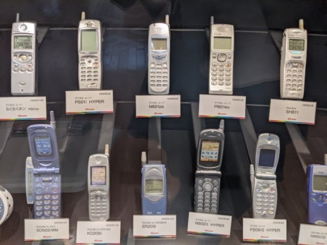 NTTドコモの携帯電話が並ぶミニミュージアム。目まぐるしい変化を見せる移動通信システムを歴史に沿って見ることができます。ガラケーやスマホだけでなく、ポケベルなども揃っており、人々の生活と寄り添ってきた懐かしのアイテムに出会えます。