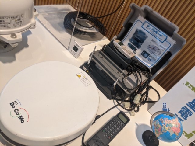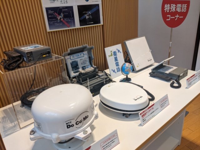 レアな展示といえば、こちらの特殊電話コーナー。山間部に持ち運んで使用できる衛星電話、サテライト・ポータブルホンN、船に設置して、航海中にも使用できる衛星電話サテライト・マリンホンなど、普段見かけることがない変わった電話が並びます。