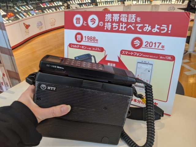 モックアップだけでなく、実際に機能していた実物モデルにふれることもできます。さきほど見かけたショルダーホンも、自由に手にとることができます。