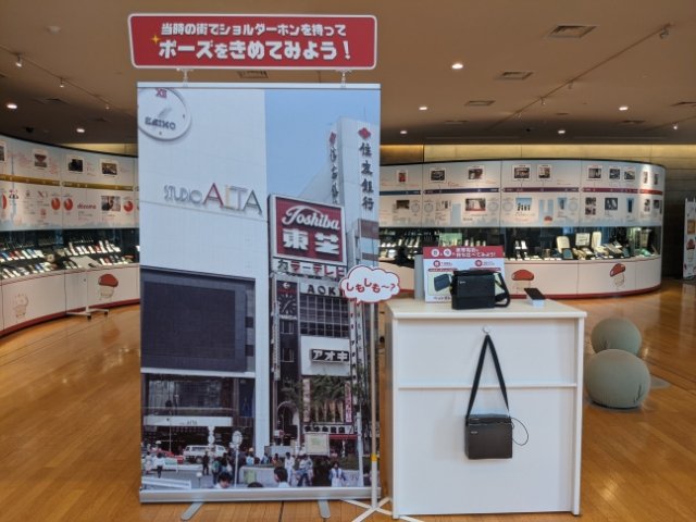 その重さなんと2.5kg。こんなの持ち歩いていたのですか?隣には、新宿スタジオアルタ前が映し出されたしもしも撮影パネルもあります。