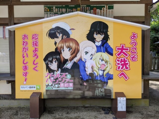 こんな大きなガルパン絵馬も見つけました!横幅は2メートル程と巨大な絵馬は、撮影スポットとして人気なようです。また、社務所のガラスケースには、キャストの方が書いた絵馬も奉納されています。ファンにはたまらないのではないでしょうか。