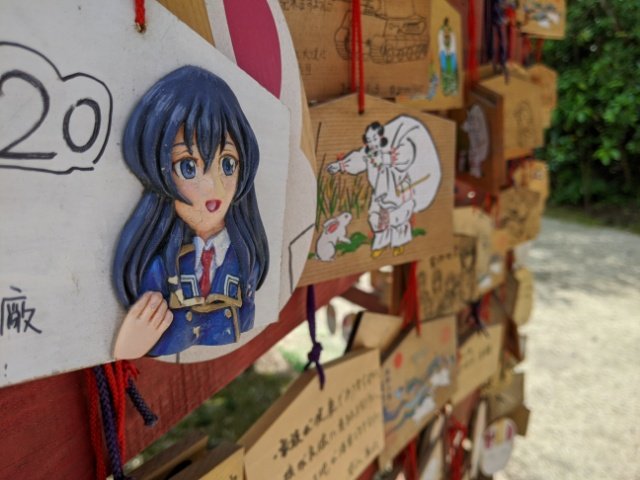 たくさんの吊るされた絵馬の中で、目を引くのはアニメキャラが描かれたいわゆる痛絵馬。「ガールズパンツァー(通称ガルパン)」の聖地でもあるため、アニメファンが多く訪れる神社でもあります。