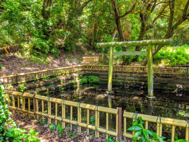 石段の手前、右側に広がる森の中には、隠れるように神池があります。境内や参道は参拝客でにぎわっていますが、ここを訪れる人はいません。とても静謐な世界が広がっていました。