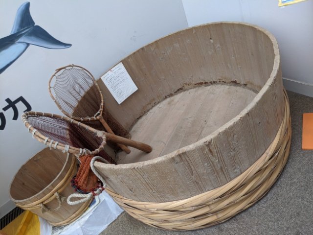 こちらは「はんぎり」と呼ばれるたらい舟。波の穏やかなとき限定で海藻を採るのに使われていたもので、安定感を出すために5cmという厚い船底を持っています。佐渡島とで見たものと比べると、かなり大きめ。大人が8人乗っても大丈夫だったそうです。