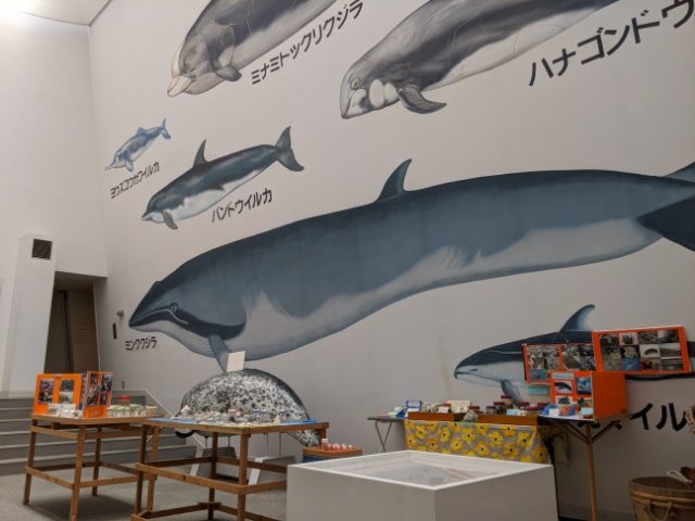 壁にはおそらく原寸大で描かれたミンククジラやハナゴンドウイルカなどのクジラのイラスト。クジラのヒゲや、胎児の標本、そして○○など、クジラ関連の展示物も多めです。