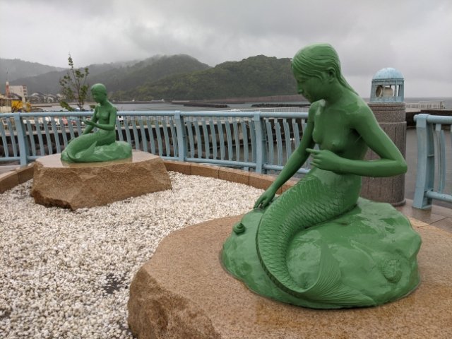 まずはマーメイドテラスの人魚の像。人魚の肉を食べて不老長寿を得た八百比丘尼の伝説にちなんでいるそう。デザインは日本の絵図で見かける妖怪のような人魚とは異なり、人魚姫風です。デンマークの人魚姫像は爆破されたりペイントされたりと、なかなかハードな歴史を歩んでいますが、こちらの人魚は平和に過ごしているようです。