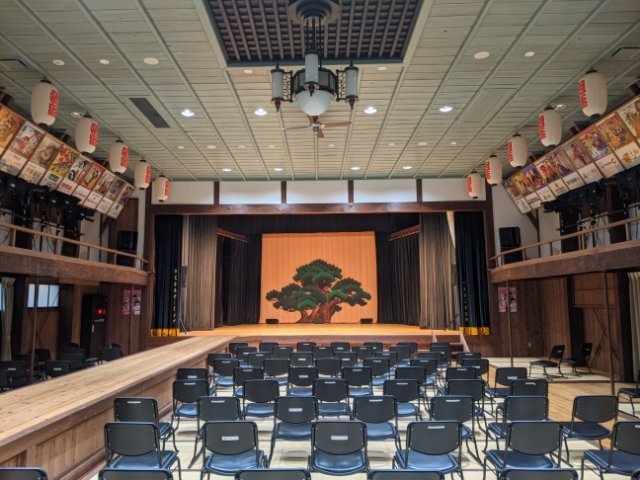 松の木が描かれたスクリーンが張られた舞台。伸びる花道や桟敷席はまさに芝居小屋。看板風に並んだスポンサー広告もユニークです。