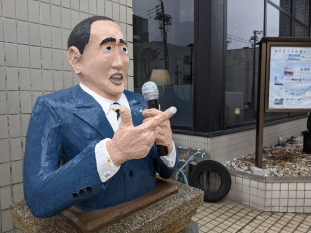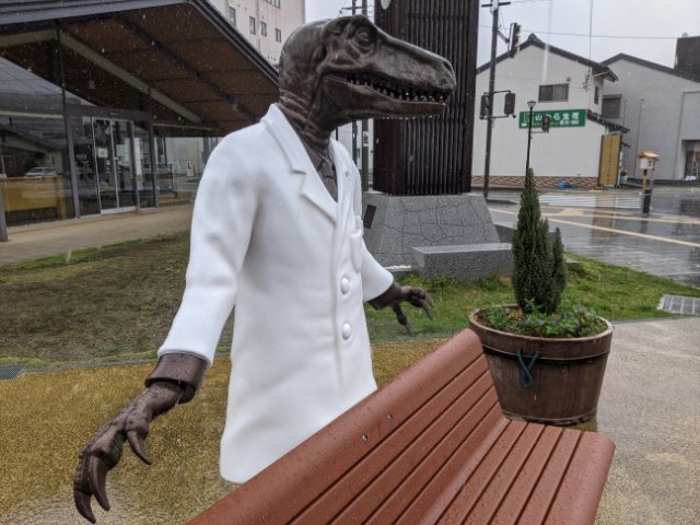 続いて、まちの駅にて見かけた恐竜博士。福井県立恐竜博物館のものは有名ですが、東尋坊や敦賀赤レンガ倉庫など、県内の各観光地にも設置されています。デザインのモデルは福井県にて発見された恐竜フクイラプトル。