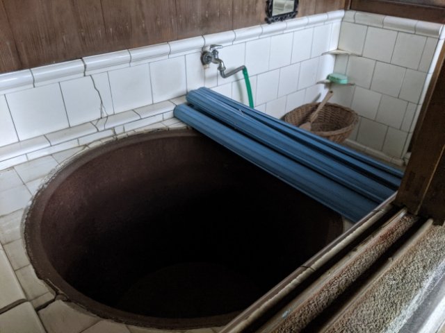 この家は京都で修行した大工さんが大正時代に建てた家屋で、商人の家でした。奥には、かまどで火を炊いて湯を沸かす五右衛門風呂も。この時代、自宅に風呂があるということは、それなりに裕福な家であったと考えられています。