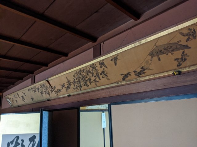 こちらはスズメがたくさん描かれた群雀図。まだ電灯の無い時代、行灯の光でゆれるスズメを数えて遊んだそうですが、酔いも手伝いまともに数えられないことが多かったそうです。