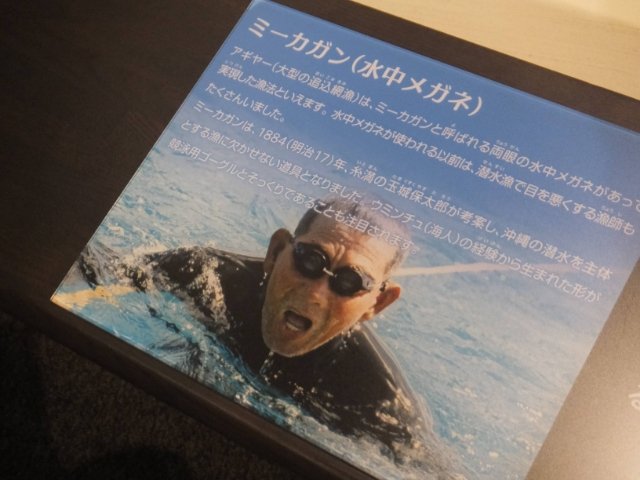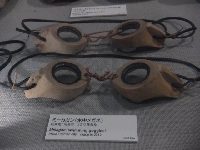 こちらのメガネは「ミーカガン」というゴーグル。モンパノキをくりぬき、ガラスをはめ、蝋などで隙間を埋めた水中メガネです。沖縄の漁師によって発明されました。