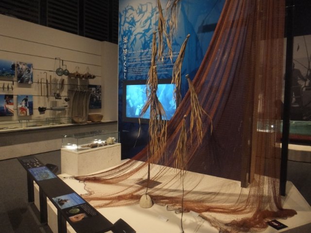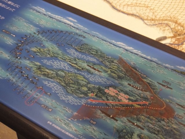 近くにはモニターが設置されており、実際の漁の映像を見ることができます。たくさんの漁師が海の中でサカナを追い込む姿は迫力あります!