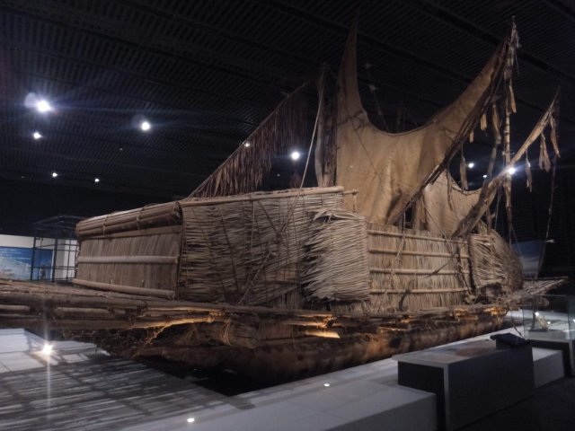こちらのまるで小屋のような船は「ラカトイ」。モトゥ(モツ)族というパプアニューギニアに住む民族の船で、大型カヌーを組み合わせて作る、大量輸送が可能な船です。カニ爪のような三日月のような不思議な形の帆を備えています。