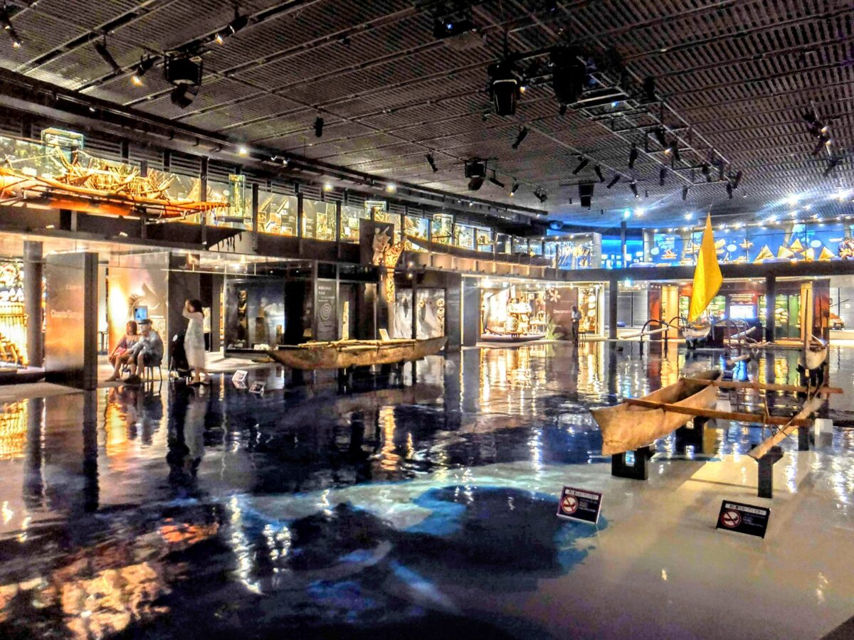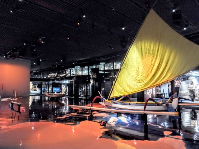 沖縄専門かと思いきや、沖縄を中心とした太平洋における海洋文化を紹介する施設。館内にはカヌーの実物や映像コンテンツなど様々な展示が広がっています。