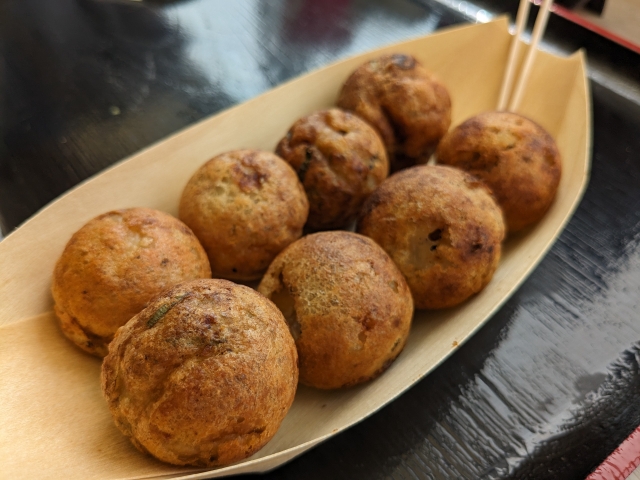 チョイスしたのは「鬼辛ソース」と「ネギポン酢」。鬼辛はしっかり辛口、ネギポン酢はさっぱりとしているので、こってり系が多い中でちょっとしたアクセントにおすすめ。ここの特徴は、ゆでダコではなく生ダコを使用しているところ。ぷりぷりとした食感も楽しめます。