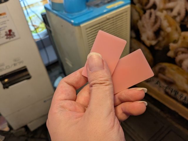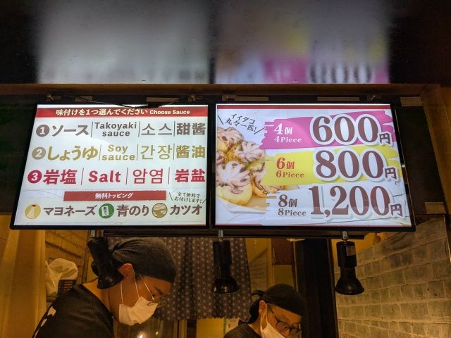 ここでは4個入りを2つ購入。ソースも気になりますが、2店目ということもあり「岩塩」と「醤油」に。トッピングは岩塩はかつお・青のりの2点、醤油はカツオ・青のり・マヨネーズの3点にしてみました。