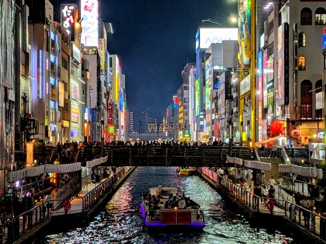 久しぶりの道頓堀は、テンションの高い「とんぼりリバークルーズ」が次々と通り抜けていきます。とってもにぎやかですが、妙に落ち着く街でした。