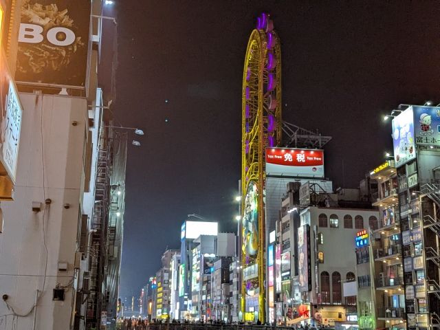 「十八番」と「踊りだこ」と2軒めぐりお腹も落ち着いたので、向かった先はドン・キホーテ道頓堀店!ここはビルの側面に世界初の座席が水平回転する観覧車を備えています!
