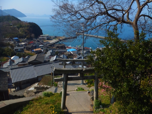 集落の中の階段を登っていくと豊玉姫神社へとたどりつきます。高台にあるため眺めがとても良い!集落を一望できる展望台でもあります。