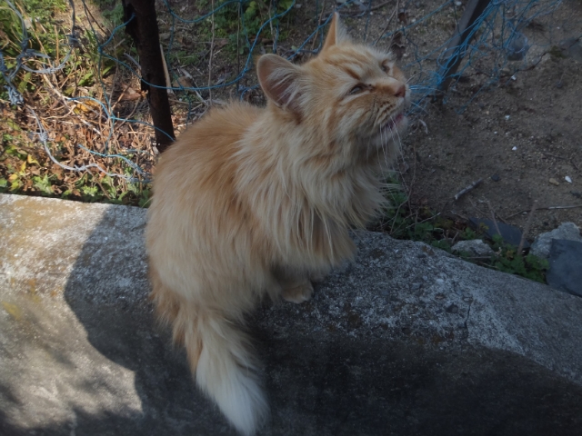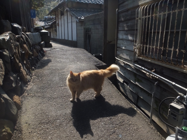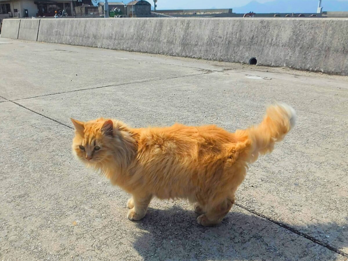 さて、アート作品をめぐったり神社をめぐったりと島内を散策している私のもとに、突然1匹のネコが駆け寄ってきました!!